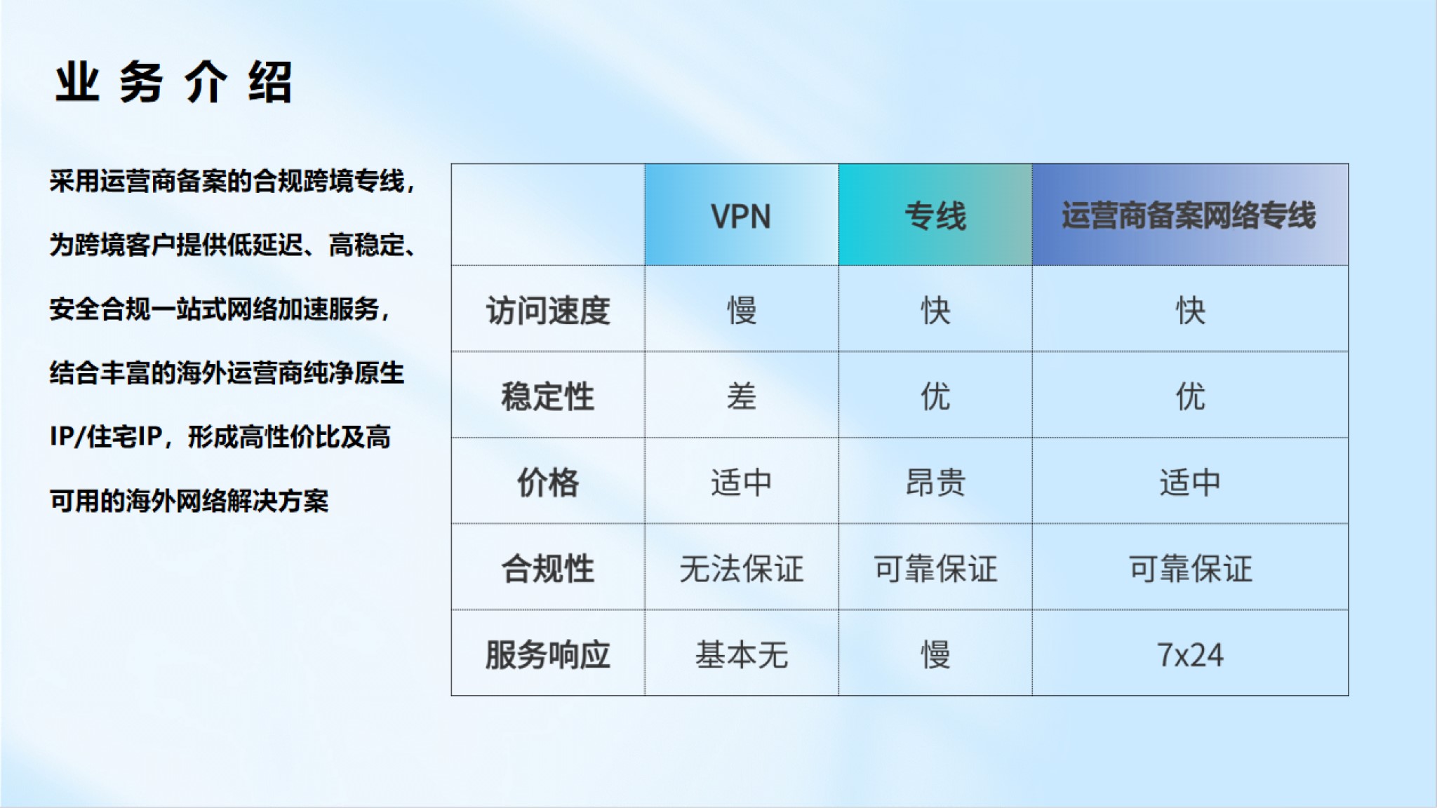 遵從運營商規則,采用運營商備案網絡專線,結合海外運營商純凈獨享原生IP,提供低延遲、高穩定、安全合規的海外網絡服務
